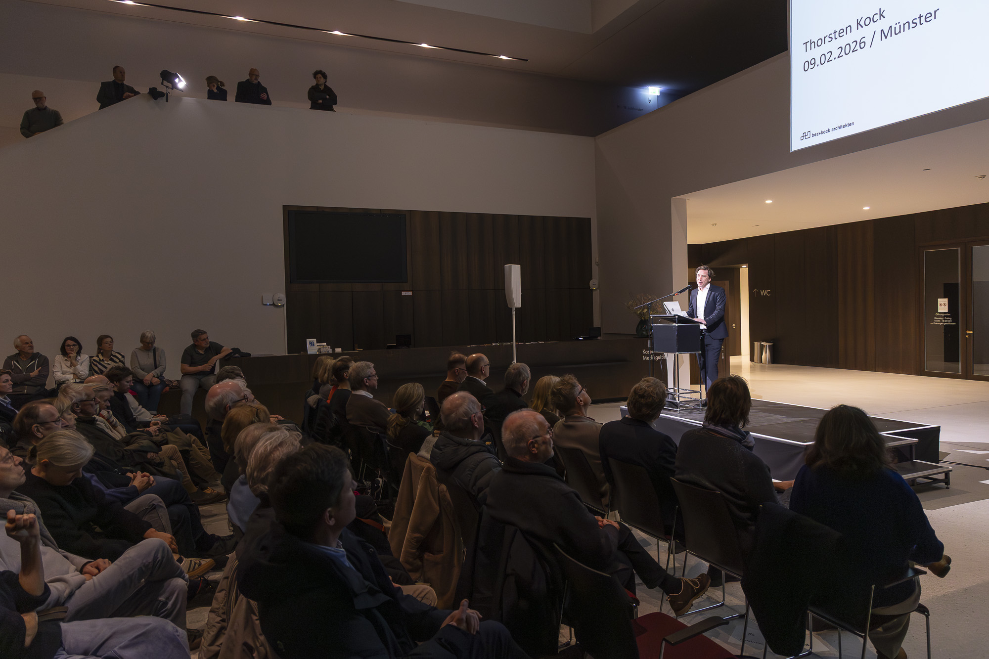 Rund 400 Zuhörer lauschten gespannt am vergangenen Montag, 9. Februar 2026, Thorsten Kock, der auf Einladung des BDA Münster-Münsterland und des Landschaftsverbandes Westfalen-Lippe (LWL) im Rahmen der Reihe „Architektur im >Kontext<“ einen Werkbericht präsentierte. Das Stuttgarter Büro bez + kock architekten hat in den letzten Jahren mehrfach neue Orte in Westfalen geschaffen: das Musikforum in Bochum, das Sauerland-Museum in Arnsberg und das Rat- und Bürgerhaus in Holzwickede. Doch auch internationale Projekte standen im Fokus.